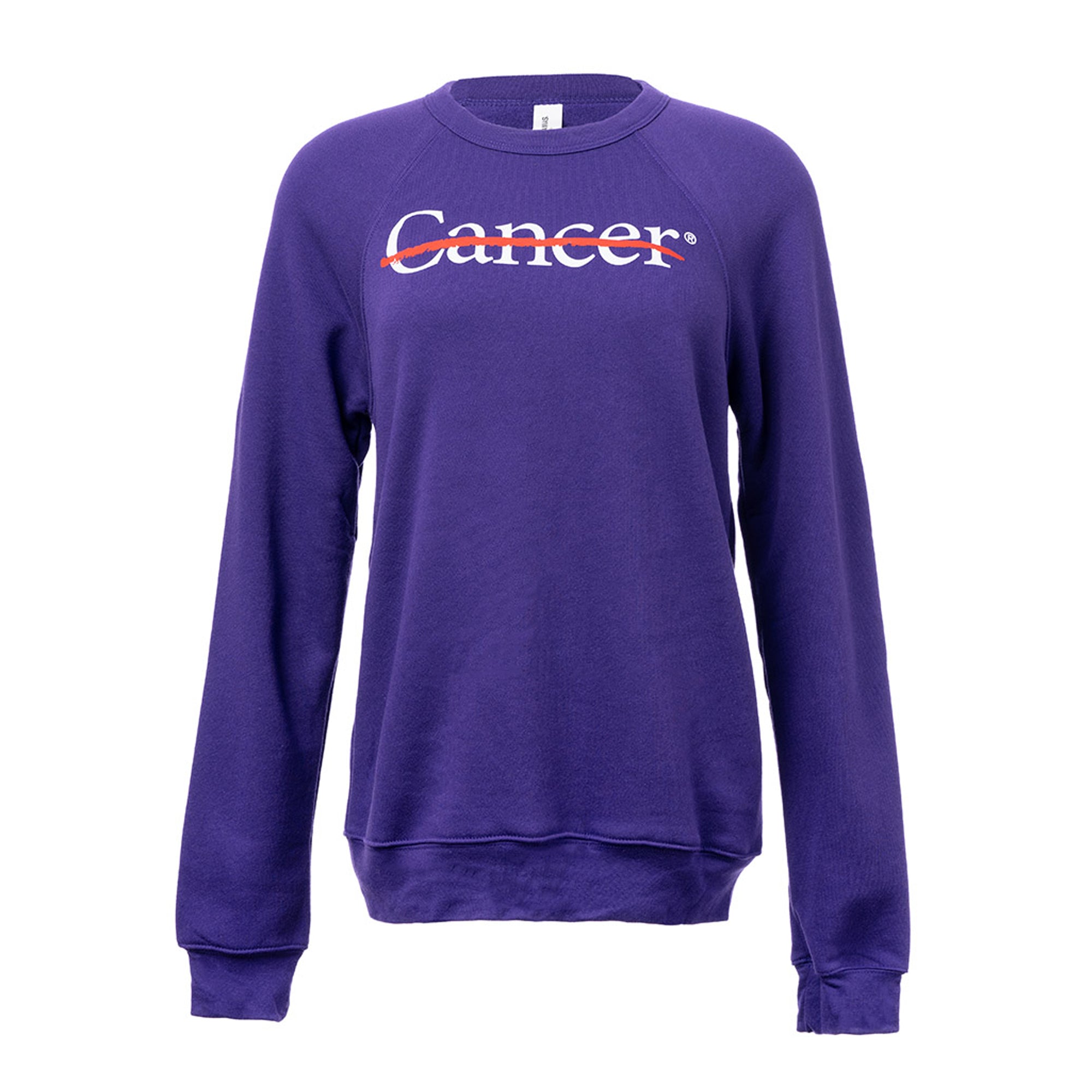 Purple crewneck featuring the white cancer strikethrough logo in the middle.